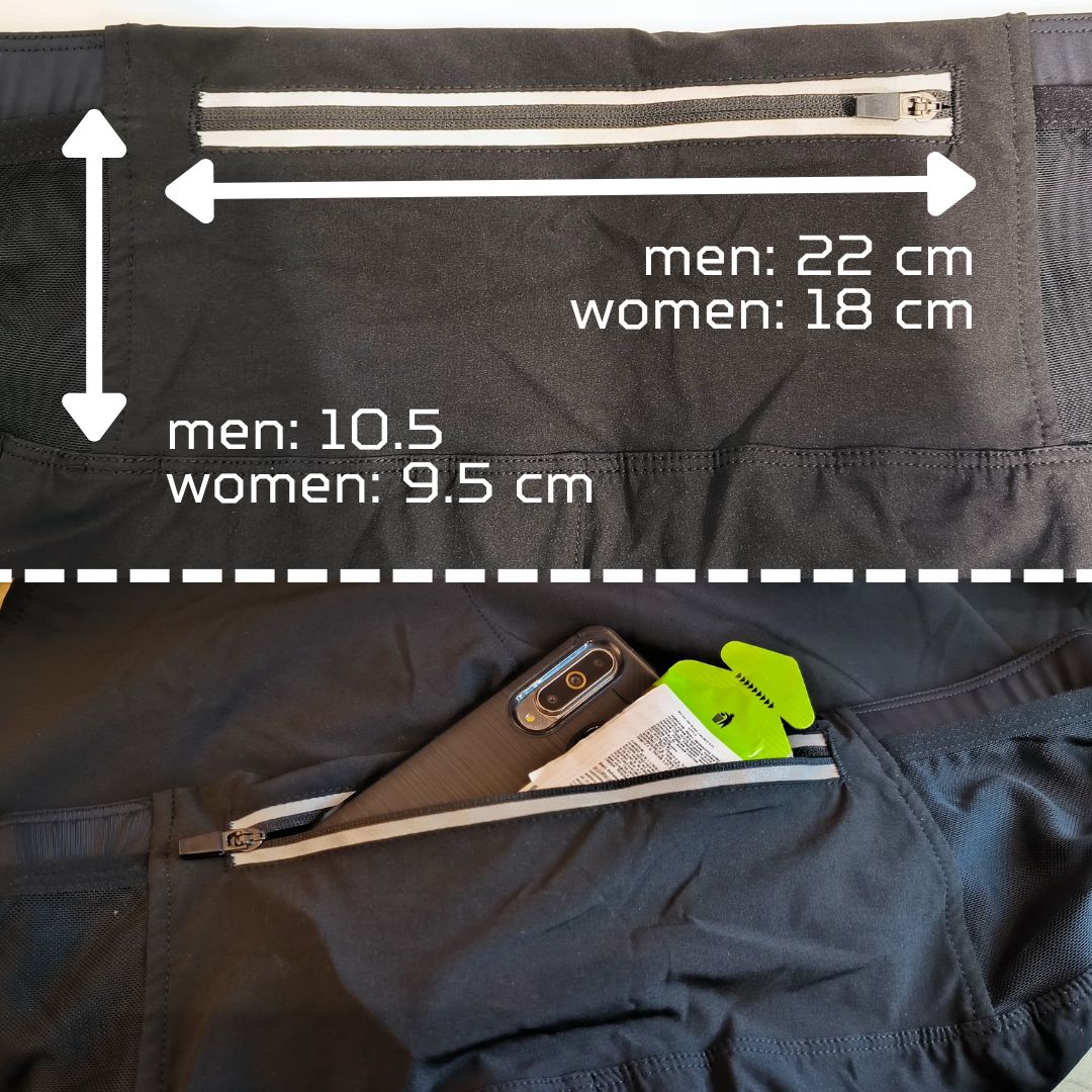 2 Waist mesh pockets (3 compartments - left, center, and right)