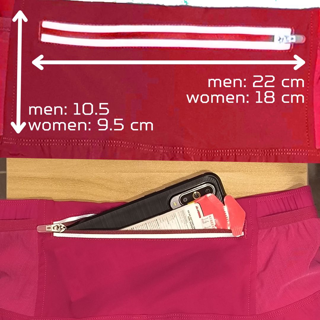 2 Waist mesh pockets (3 compartments - left, center, and right)