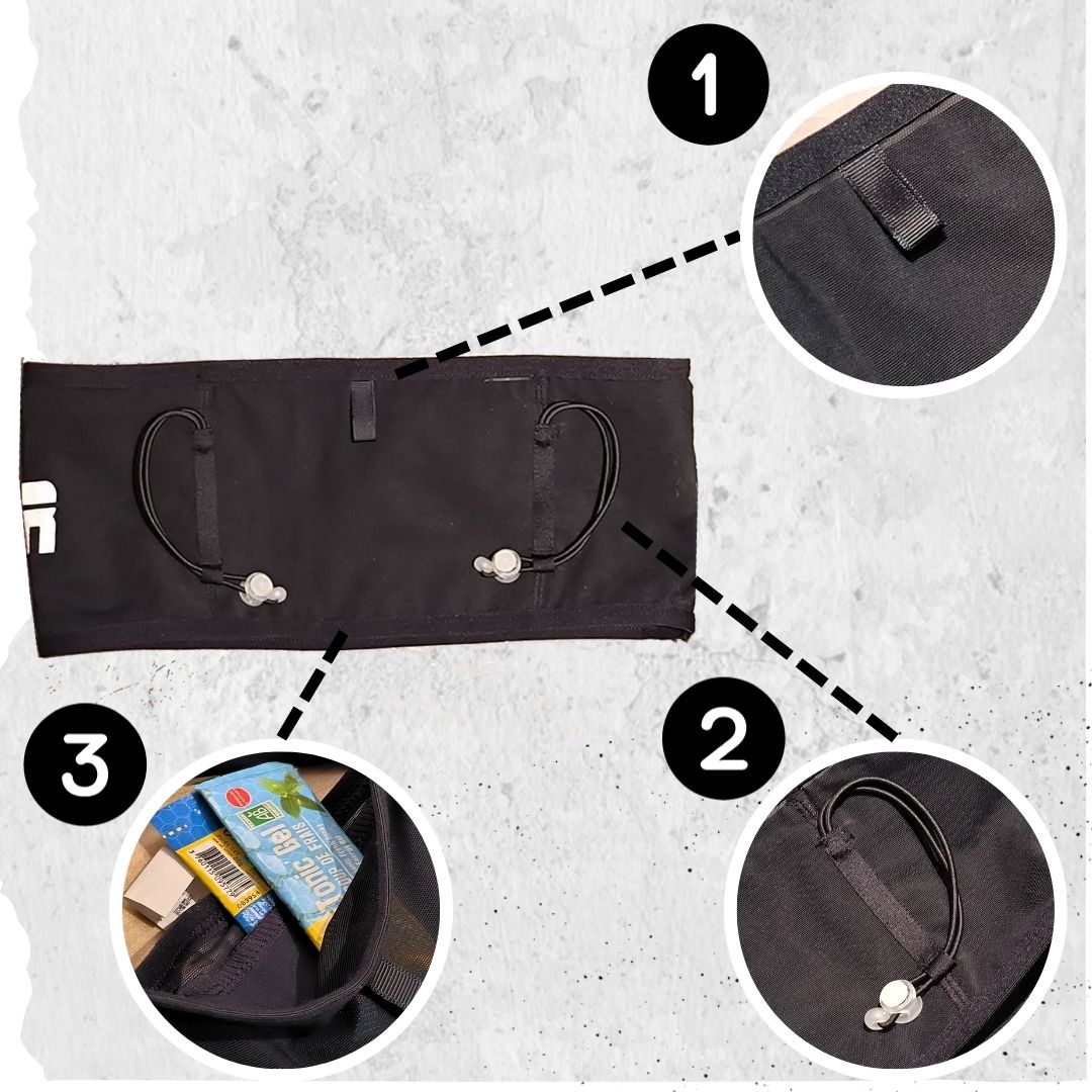 Suitable for carrying energy gels, energy bars, sunglasses, and headlamps.