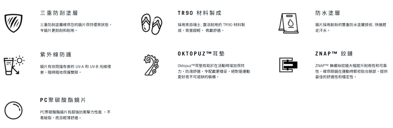 鏡片採用創新的雙重防水塗層技術, 快速趕走汗水。