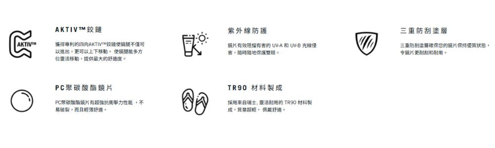 獲得專利的四向AKTIV™鉸鏈使鏡腿不僅可以進出,更可以上下移動。 使鏡腿能多方位靈活移動,提供最大的舒適度。